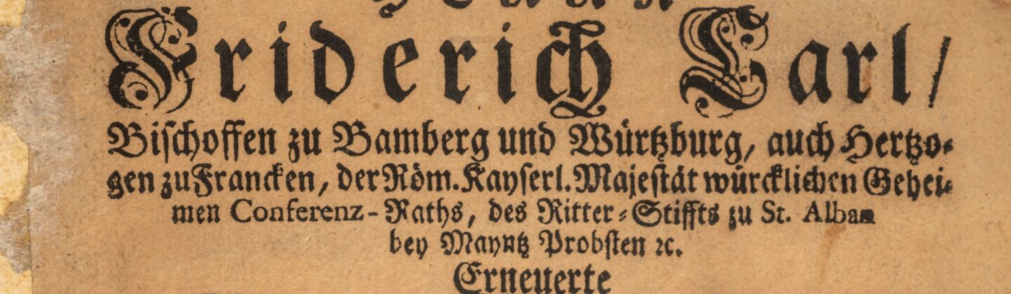 Des Hochwürdigsten des Heil. Röm. Reichs Fürsten und Herrn / Herrn Friderich Carl/ Bischoffen zu Bamberg und Würtzburg/ auch Hertzogen zu Franken, der Röm. Kayserl. Majestät würcklichen Geheimen Conferenz-Raths, des Ritter=Stiffts zu St. Alnam bey Mayntz Probsten Erneuerte Tax=Ordnung Deren Apotheckeren Wie solche in dem Bistthum Würtzburg und Hertzogthum zu Franken inskünfftig gehalten werden soll.