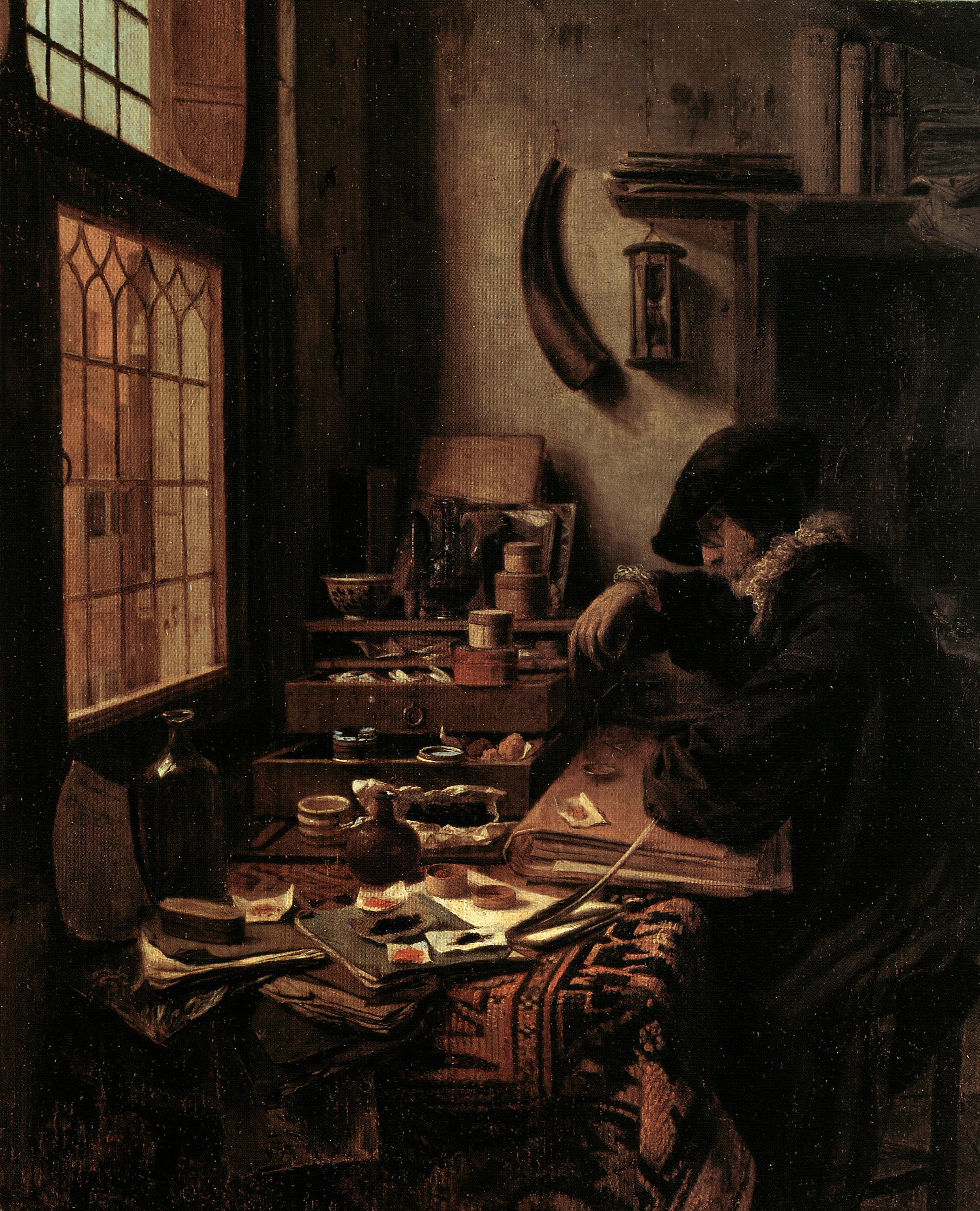 Die, die bleiben, wenden sich jenem Farbenhändler zu, den uns Job Berckheyde in einer seltenen Darstellung gemalt hat. Sie zeigt uns einen Handel im Kleinen, einen engen Verkaufsraum mit all den Requisiten, die wir erwarten: Einer kleinen Waage, gefalteten Papieren, auf denen geringe Mengen farbiger Pulver liegen, ein Windstoß würde genügen ... Muscheln, hölzerne Dosen, ein Einnahme- und Ausgabebuch, auf das sich der Farbenhändler stützt ... Erfüllt dieses Bild unsere Vorstellungen? Ist dieser Farbenhändler Teil der Antwort auf die Frage: Woher bezog Dürer seine Farben?